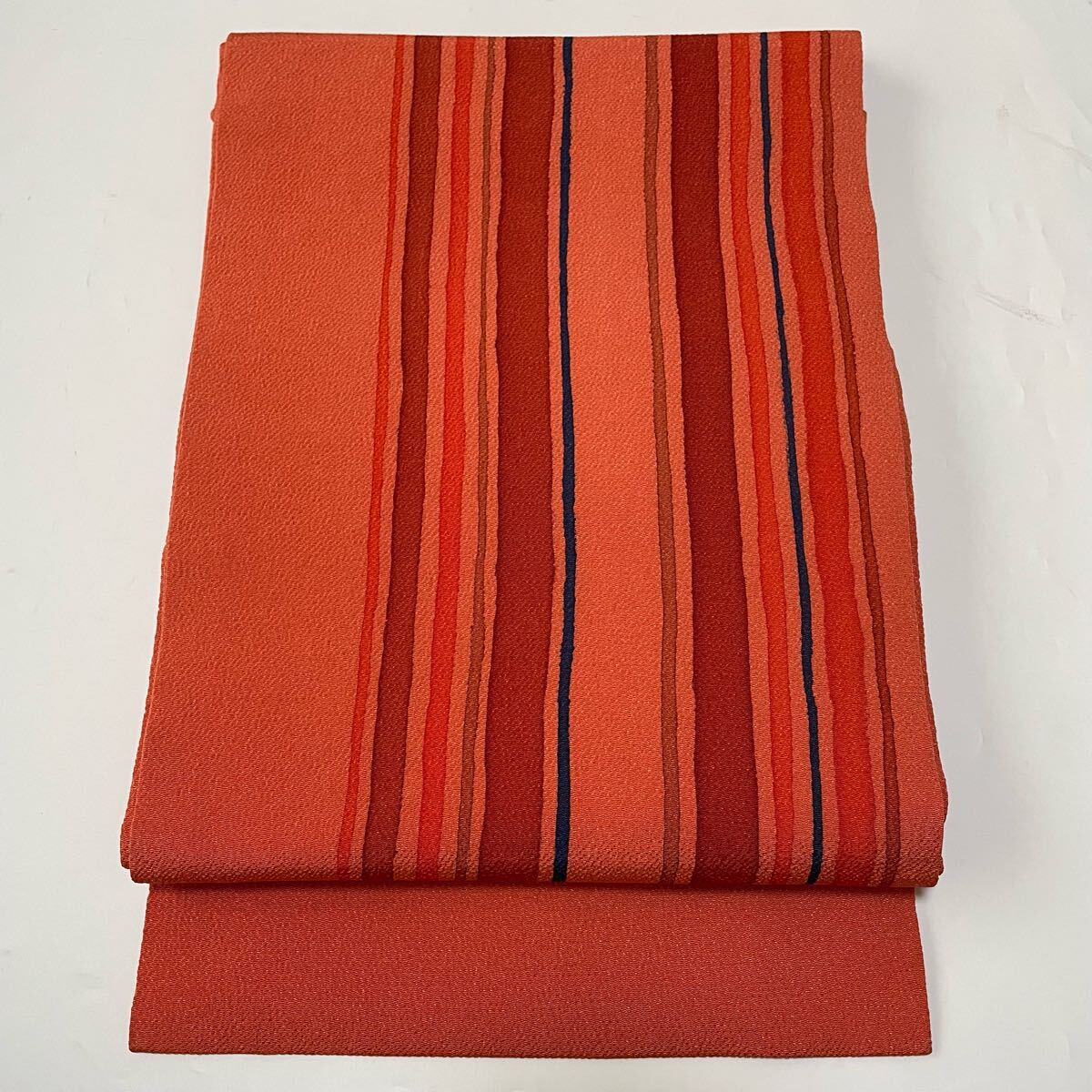 - #F161 名古屋帯 九寸 浜ちりめん 縮緬 縦縞模様 正絹 鉛丹色 お洒落 和装 和服【wellriver】