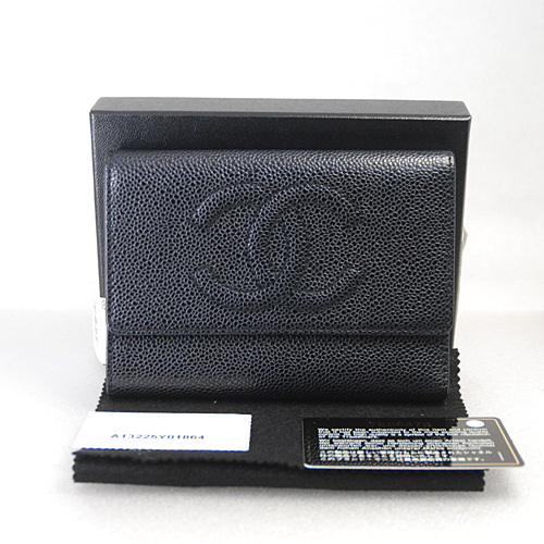 > シャネル ココマーク キャビアスキン 三つ折り財布 ブラック 00V 小銭入れあり(15817)