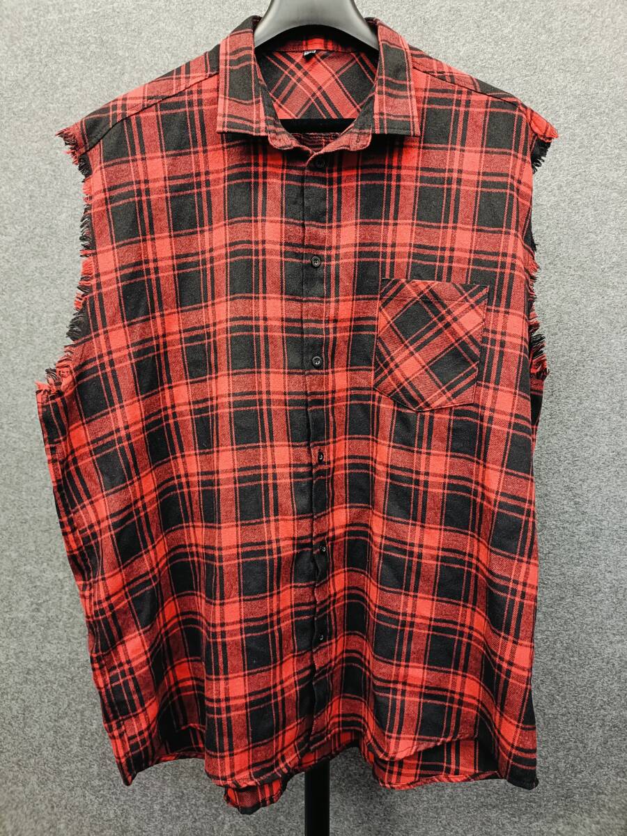 - ★ノースリーブ カットオフ チェックシャツ ノーブランド 赤 黒 3XL