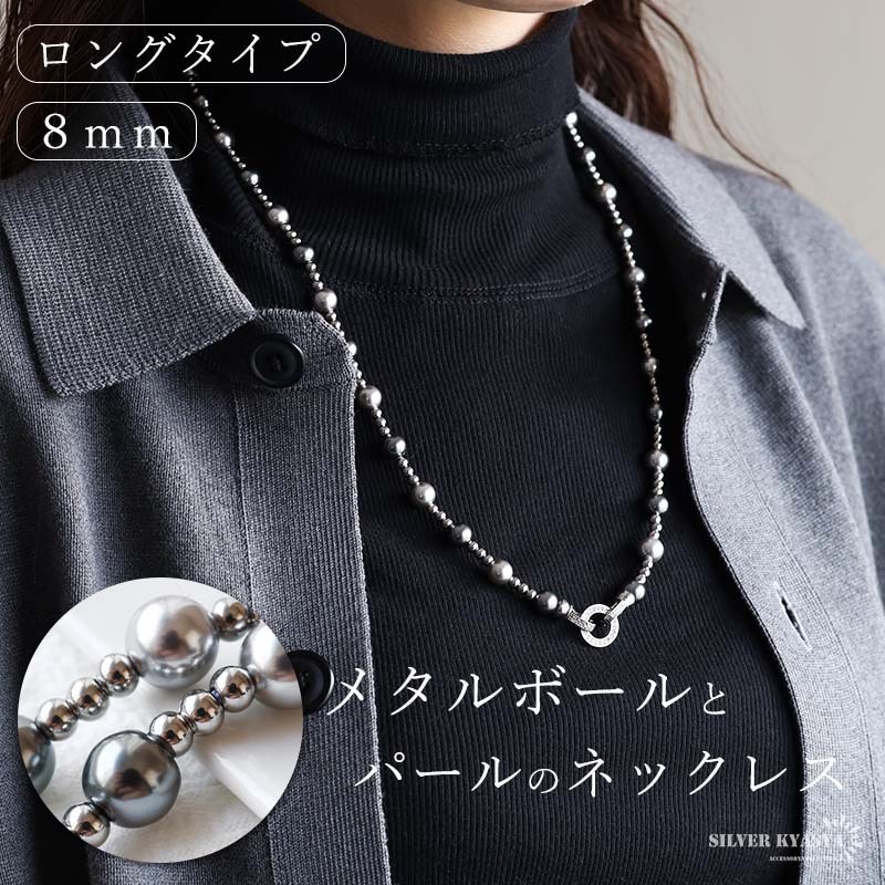 - ステンレス パールネックレス メタルボールネックレス シルバー グレー 真珠 フォーマル ロングネックレス 女性 金アレ対応