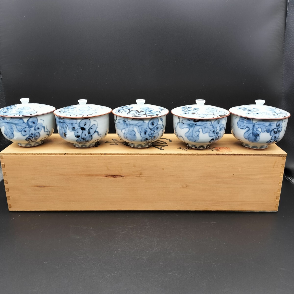 > 有田焼 汲出揃 手描きブドウ 蓋付汲出 湯呑み 煎茶器 煎茶道具 染付 湯呑 ト13