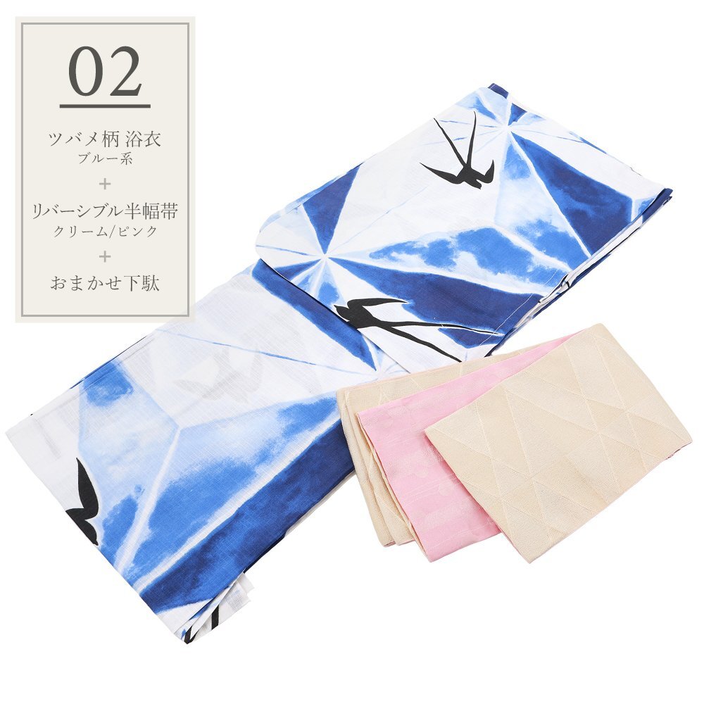 > ◆涼しげ◆クイーンサイズ 綿麻 お仕立て上がり浴衣 3点セット 帯 下駄 3yk-rn (02ツバメ柄) 【大きいサイズ 祭り 盆踊り ゆかた】