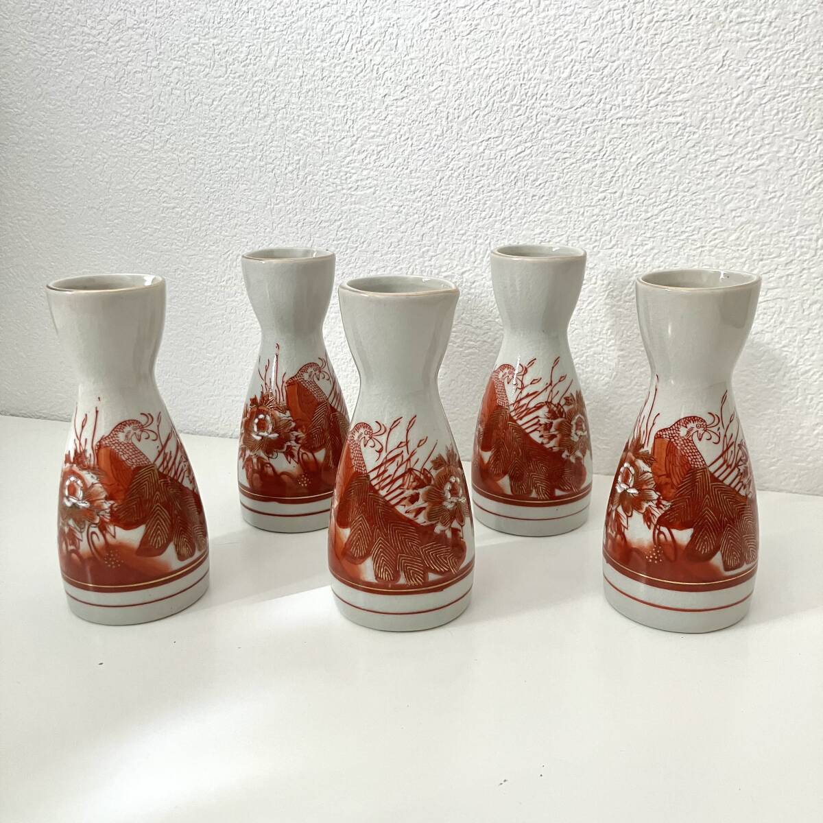 - 九谷焼 徳利5個セット 酒器 赤絵 孔雀 牡丹