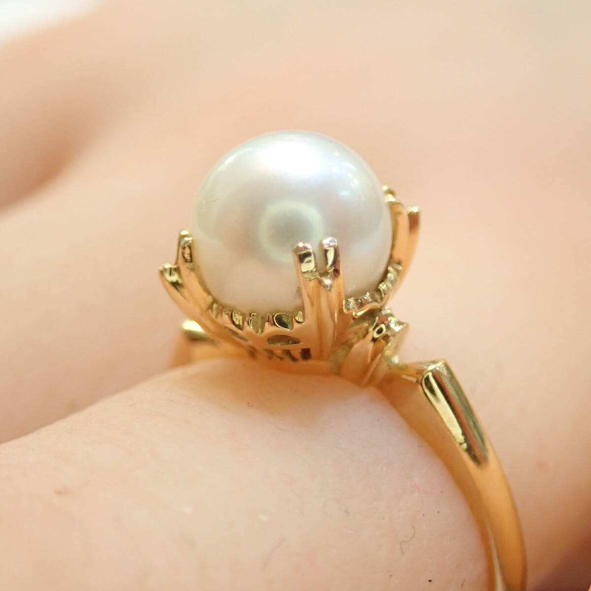 > ■K18 約7.9mm あこや真珠リング■アンティーク 昭和レトロ■穴透かし■パール 本真珠 アコヤ■指輪■中古磨き仕上げ■