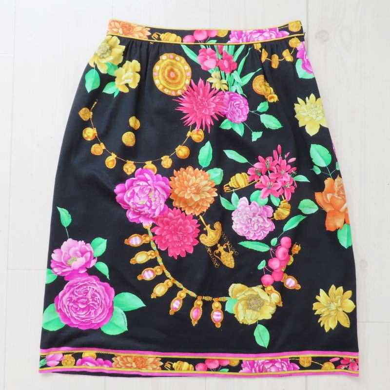 - M02-k039 LEONARD レオナール フラワー柄 ウール/シルク/キュプラ スカート ウエストサイズ69 マルチカラー