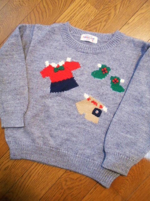 > FAMILIAR・ファミリア☆キッズ110cm☆ウールブレンド♪キュートなお洋服柄クルーネックセーター 良品