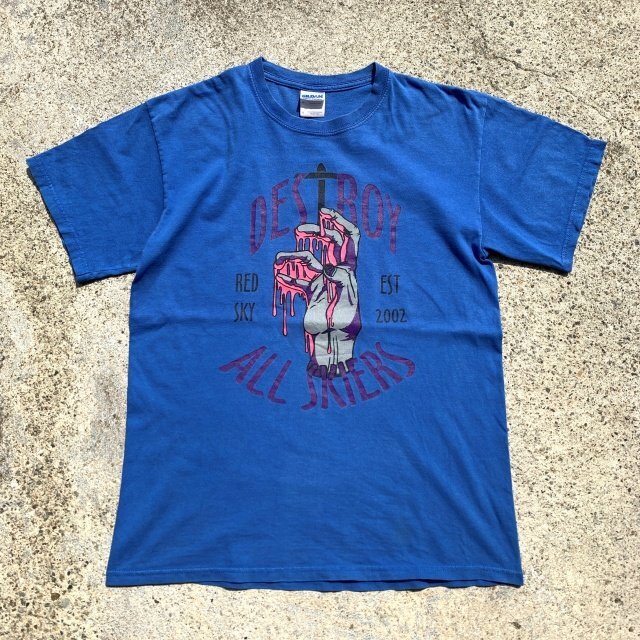 > 【M】2000s GILDAN デストロイスキーヤー プリントTシャツ 青■ビンテージ オールド レトロ アメリカ古着 ハンド 手