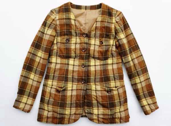 > ◆ 難有り 50's UNKNOWN ノーカラー ウールジャケット ブレザー レディース 茶チェック/ビンテージ オールド アメリカ古着 レトロ