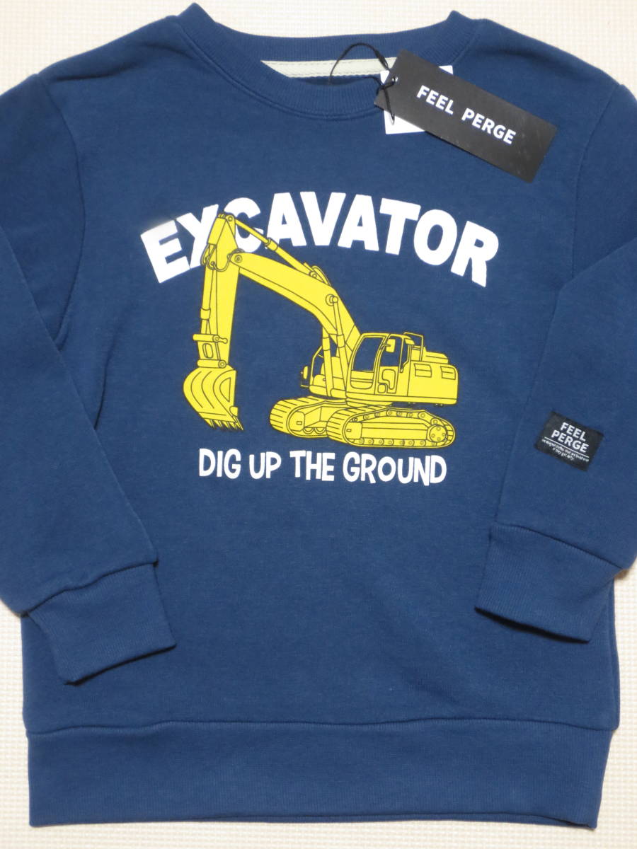- 新品 130 働く車柄 長袖トレーナー 紺 パワーショベル 重機 建機 ショベルカー はたらくくるま 男の子 冬物 裏起毛 120cm~ 送料無料