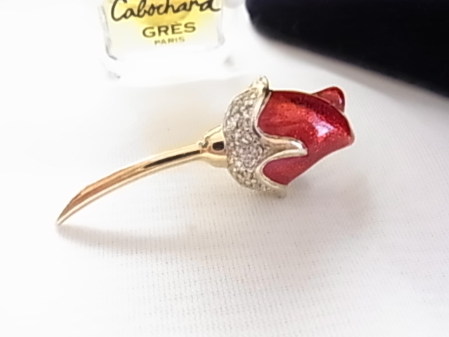 > ビンテージ/ヴィンテージ ルビーレッドトーンのエナメル系のカボションストーンのお花 チューリップみたい キラキラ系 ピンブローチ▽