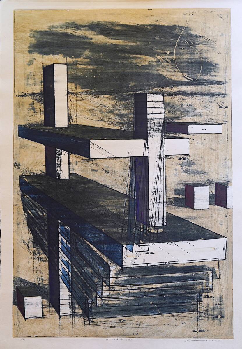 > 【真作・額装】河内成幸 大判木版画(凸凹摺り)『加速夢Ⅲ(The Accelerated Dream)』Ed.35の内,No.1 1984年 直筆サイン入●新版画 創作版画