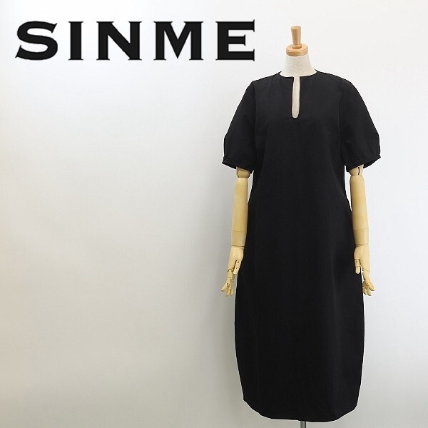 - ◆SINME シンメ リネン混 コットン Uネック 半袖 ロング コクーン ワンピース 黒 ブラック M
