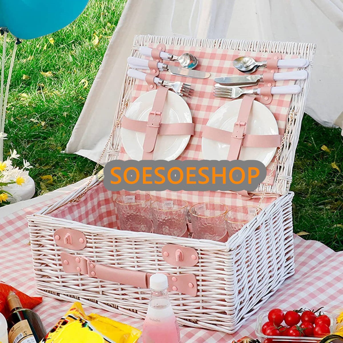 - ピクニックバスケット 食器付き 蓋付き 籐 ウィッカー 屋外 ピクニック バスケット 収納バスケット ハンドル付き 4人用-ピンク