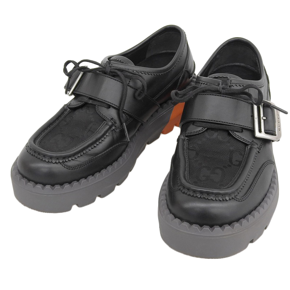 > 箱付美品 グッチ 2023年商品 23AW 739868 GGキャンバス レザー シングルモンク スニーカー シューズ ブーツ 黒 26-26.5cm相当 メンズ 旅
