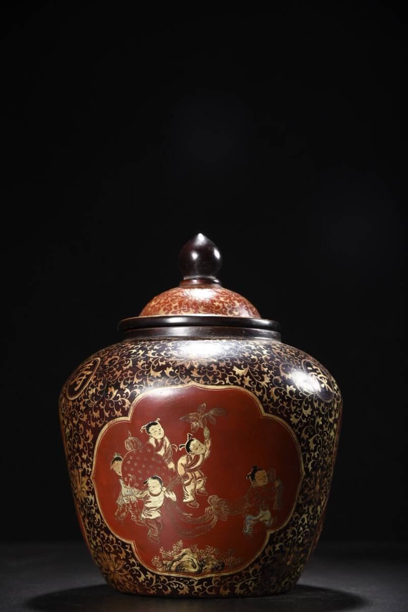 - 【仁】『木胎漆器彫・描真金・嬰戲紋・蓋罐・置物・賞物』極細工 古賞物 中国古玩 古美術 古美味