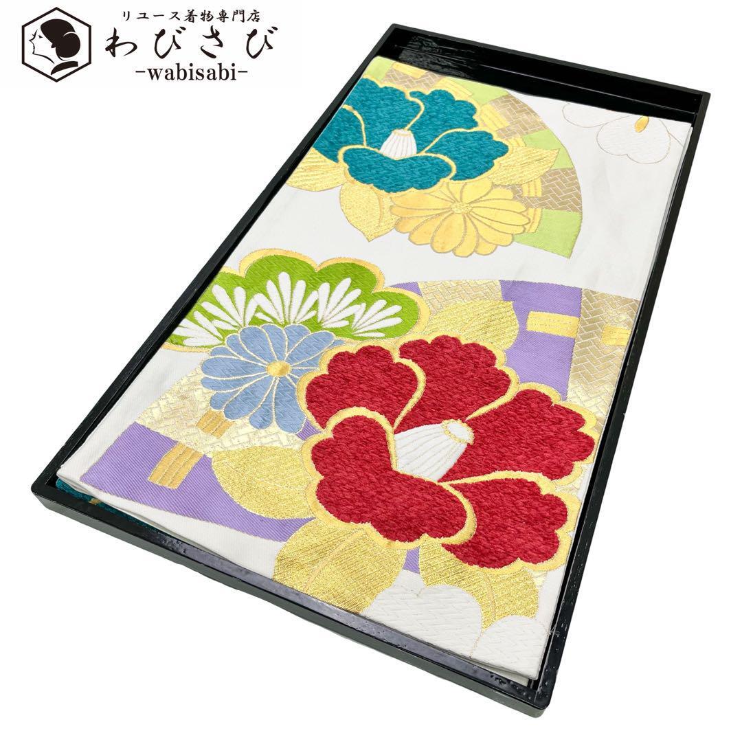 > 袋帯 地紙に椿屋菊の花模様 金糸 白色 振袖 O-4769 着物 きもの kimono 和服 和装 中古 リサイクル着物 【送料無料】