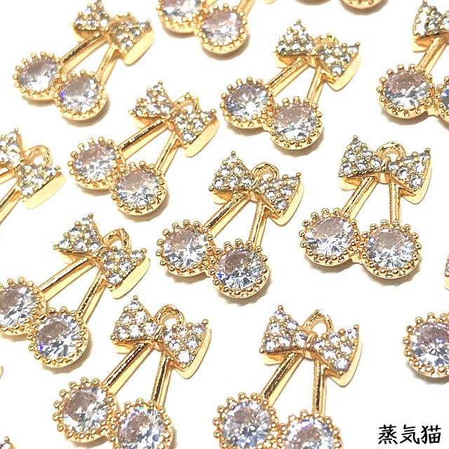 - c2155 さくらんぼリボン ジルコニアチャーム4個【フルーツ 果物ピアス イヤリング 材料ハンドメイド アクセサリーパーツ素材】蒸気猫パーツ