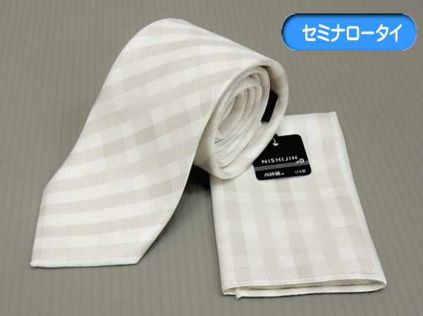 > 西陣織 フォーマルナロータイ チーフ付 白×シャンパン 格子 シルク100% 日本製 礼装 結婚式・披露宴 細ネクタイ メール便可 njc13-NR