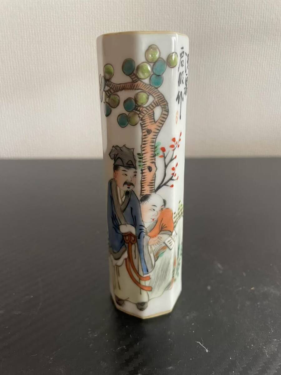 - 中国磁器 八方パステル人物物語線香筒 中華民国模倣同治(1925年頃) 高さ11cm 直径3cm 口径3cm