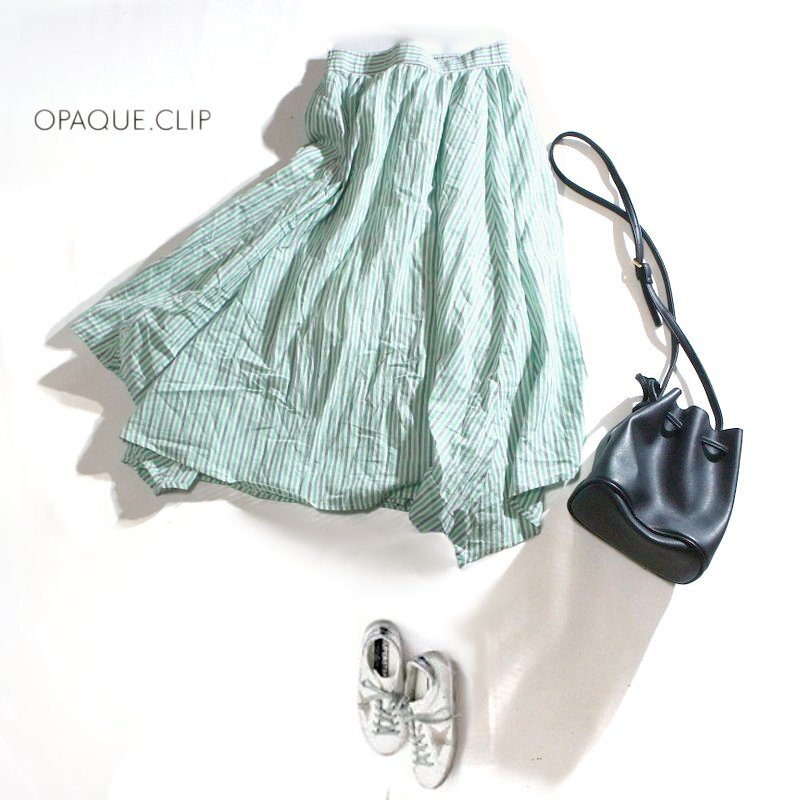 > オペ―ク ドットクリップ OPAQUE.CLIP 株) ワールド 春 夏 涼し オーガンジー マルチストライプ シャツ ロングフレアスカート 36 7号 緑