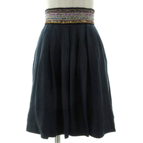 > シップス SHIPS スカート ボックスプリーツ フレア スパンコール 刺繍 ひざ丈 日本製 ネイビー系 紺系 マルチカラー S レディース