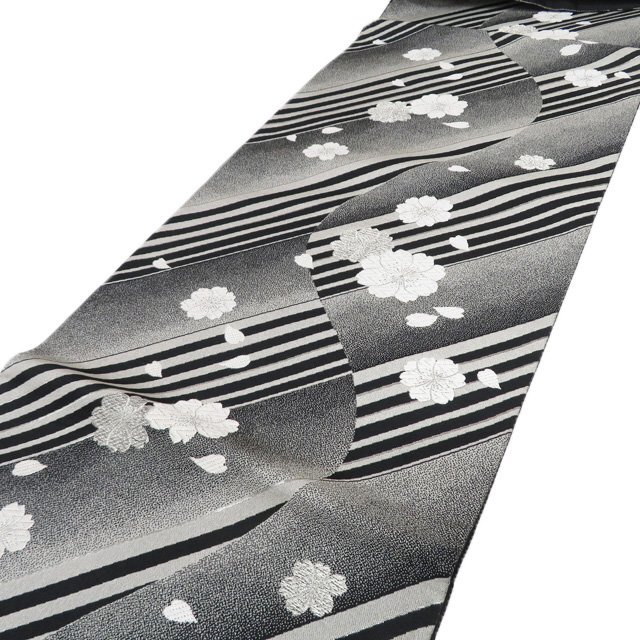 - 袋帯 振袖用 中古 リサイクル 正絹 フォーマル 仕立て上がり 六通 花模様 桜 箔糸 銀通し 黒色 薄墨色 銀 きもの北條 A1159-14