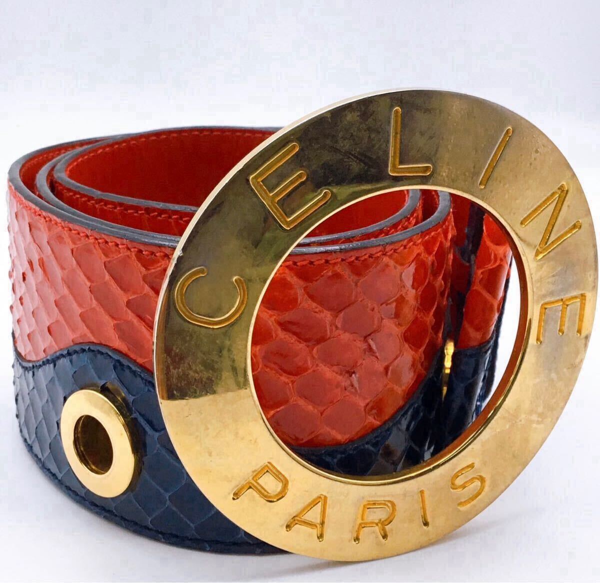 > OLD CELINE セリーヌ 美品 Vintage パイソン レザー ウエスト ベルト ゴールド メタルサークル ロゴ バイカラー ベルト幅5cm 入手困難