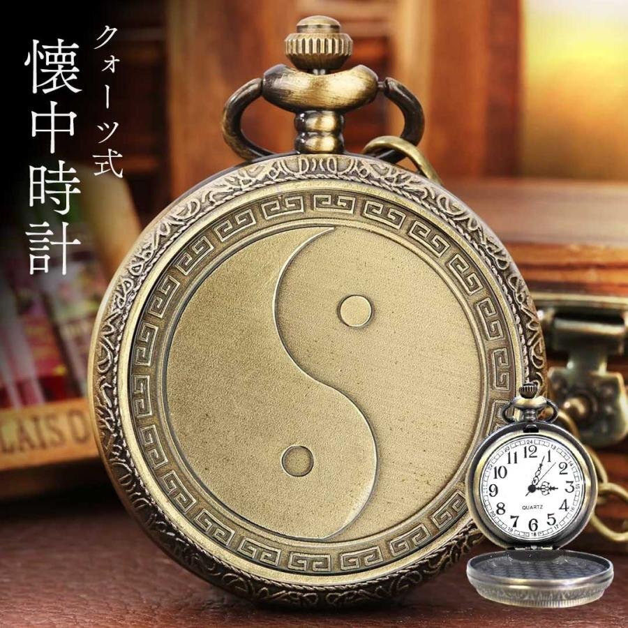 - 懐中時計 ブロンズ 陰と陽 ヴィンテージ アンティーク風 チェーン付き 高耐久性 文字盤 メンズ レディース ユニセックス レトロ クラシック