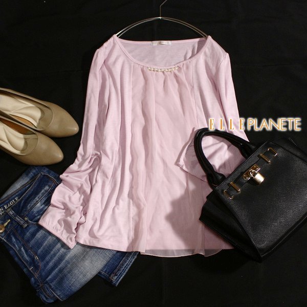 - 美品 ELLE PLANETE エルプラネット 綺麗めパールビーズ付き シフォン重ね ストレッチ カットソー 38号 M 春 夏 25B03