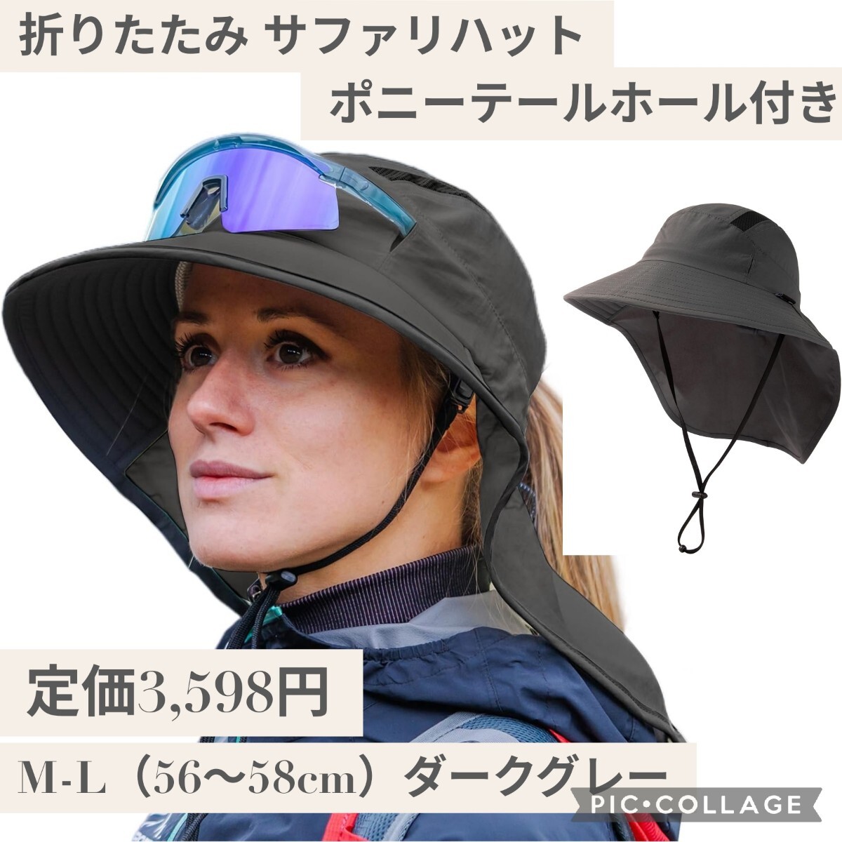 > 新品未使用 定価3,598円 56〜58cm ダークグレー☆サファリハット レディース ポニーテールホール付き 紫外線対策 日除け帽子 あご紐 つば広
