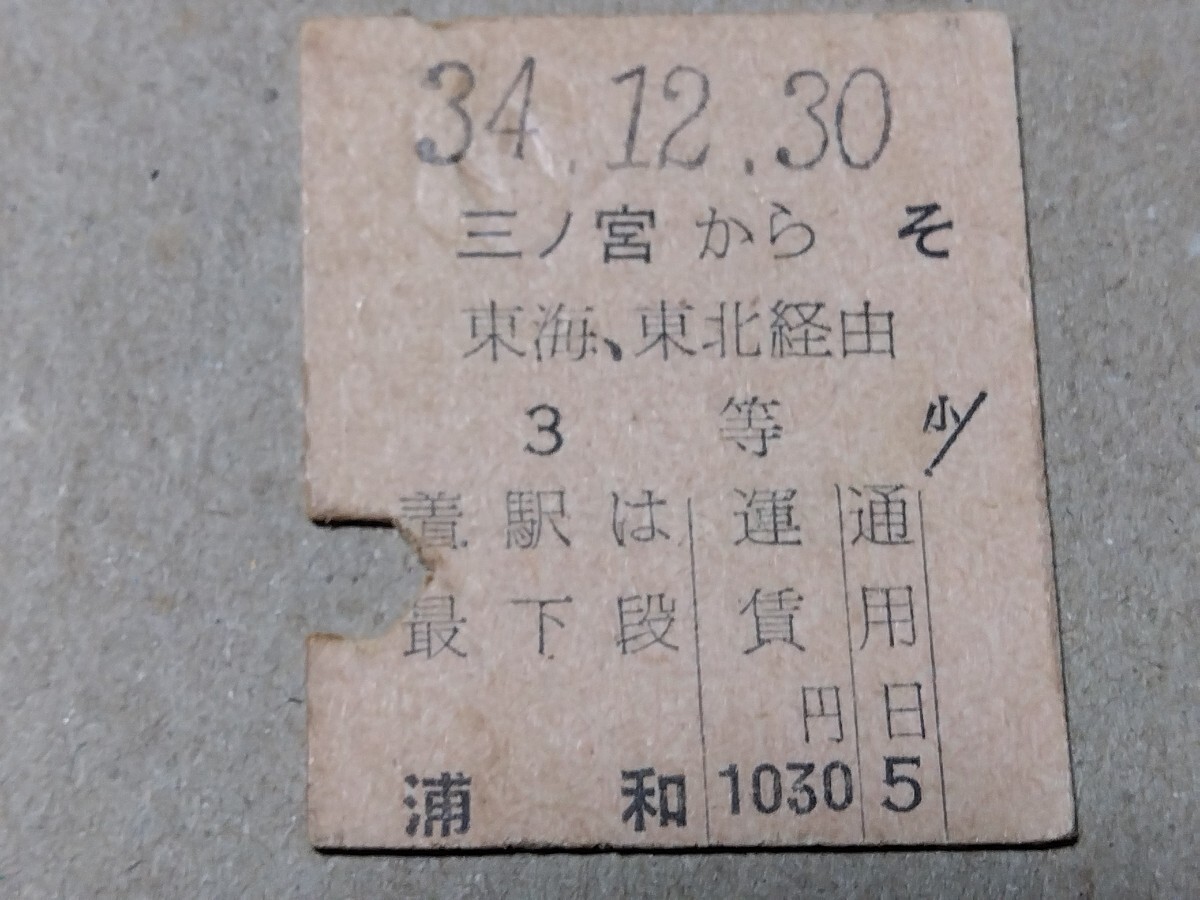 - 250314-116【国鉄きっぷ】硬券 三ノ宮→浦和 準常備片道乗車券 昭和34年