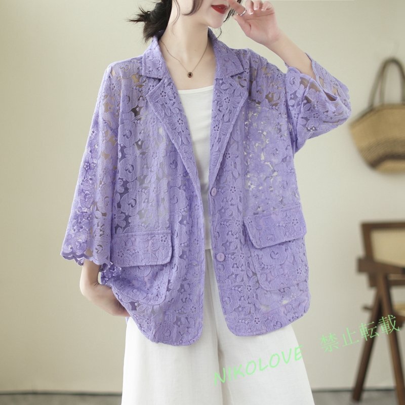 - ☆新品 レディース カジュアル ゆったり大きいサイズ 可愛い総レース 上着 スーツジャケット 紫 MK450