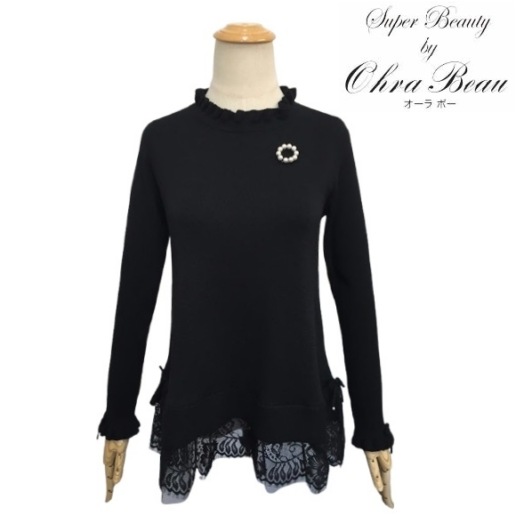 - スーパービューティー 40 セーター 裾レース使い フリルネック ラメ入り 2421042 ブラック M 2024/2025年秋冬 オーラボー 大人かわいい服