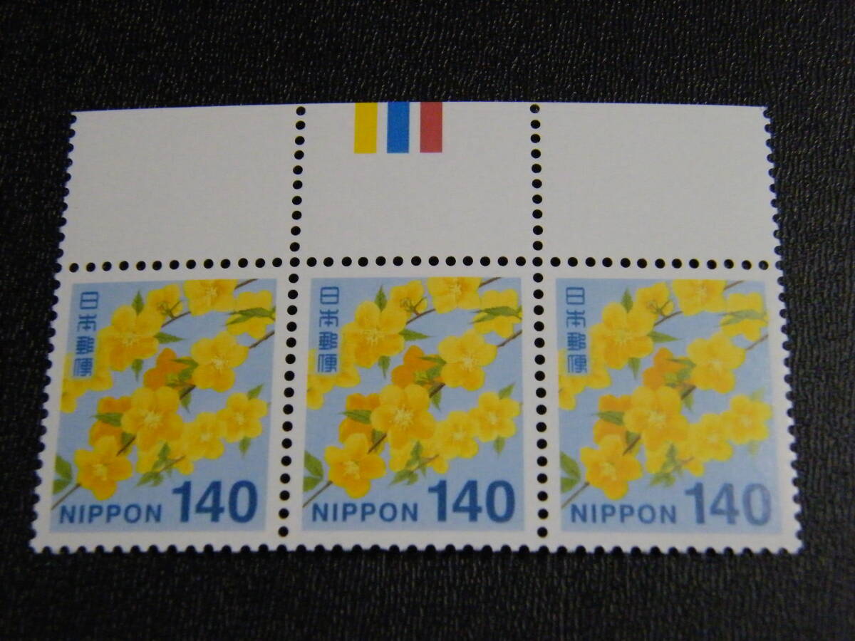 - ヤマブキ 140円 カラーマーク上 綴じ穴無 3枚ブロック 未使用 2014年シリーズ(CM付)