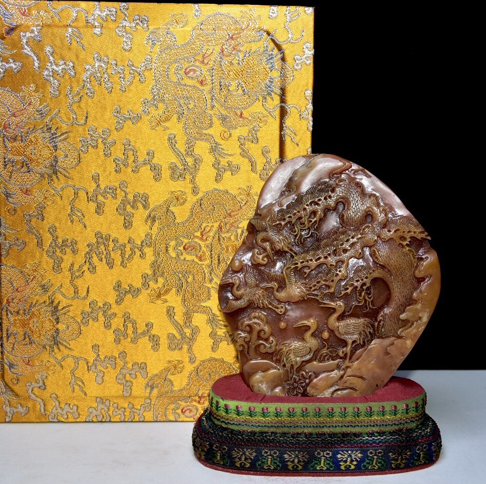 - 唐物 【明代の篆刻家 文彭】寿山石 芙蓉石《松鶴延年》置物 原始原色 天然石 手彫 篆刻 中国美術品 時代物 D63
