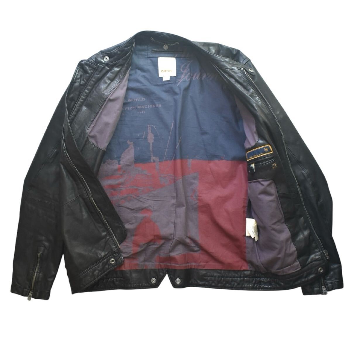 > 【伝説級】極美品 DIESEL 裏地総柄 ラムレザー シングルライダース S(M相当) 黒 old DIESEL 00s TALON zip エンブレムチャーム 羊革