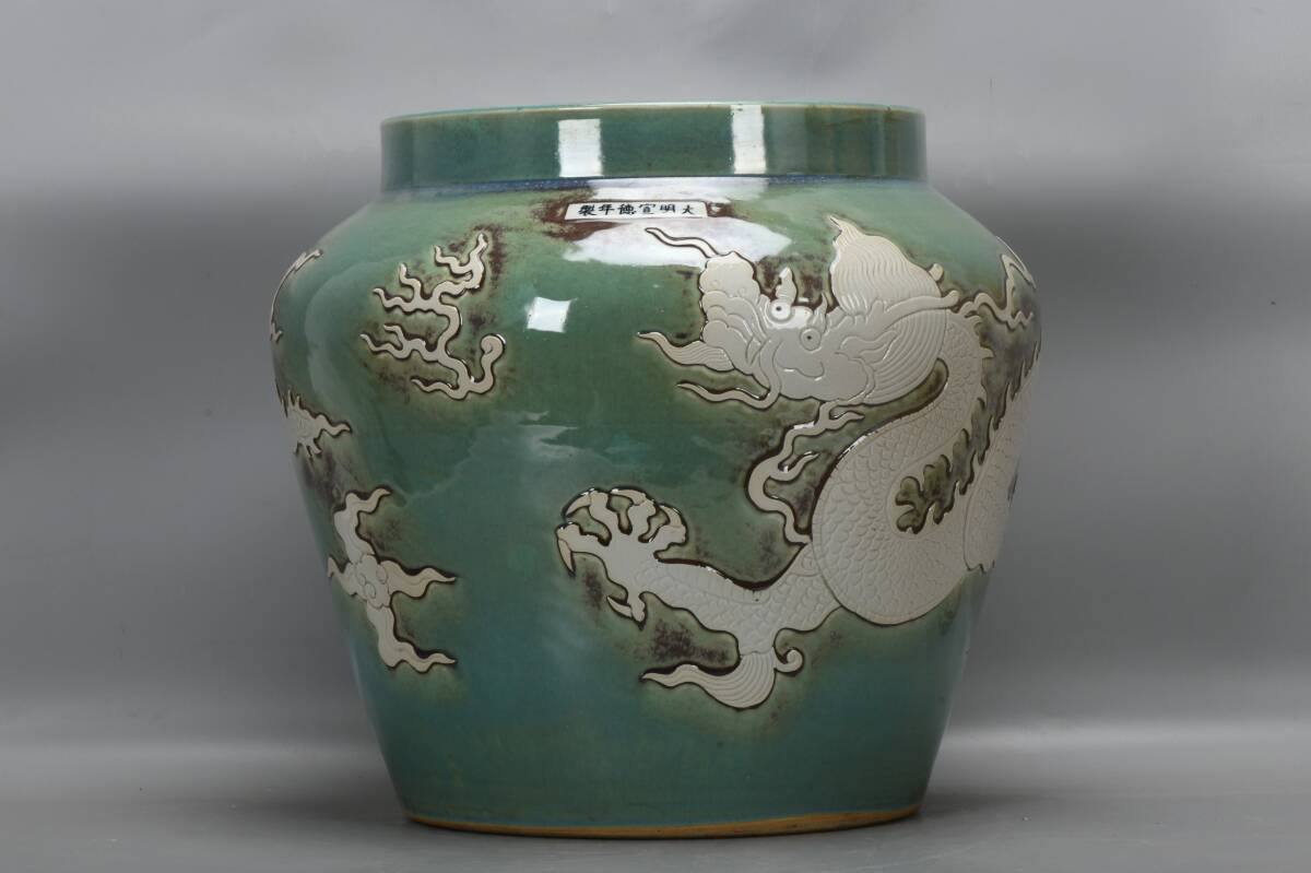 > ◆旧家蔵出◆古美術 中国古玩 大明宣徳年製款 窯変 留白龍紋大缸 置物 擺件 古賞物 骨董 時代物 A04