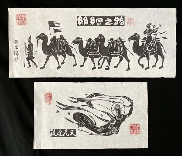 - MM9003[版画]西出陽関図 絲綢之路 シルクロード 敦煌飛天 敦煌壁画 まくり 2点 紙本 版画 人物画 鳥獣 菩薩 仏画 中国 唐絵 美術品