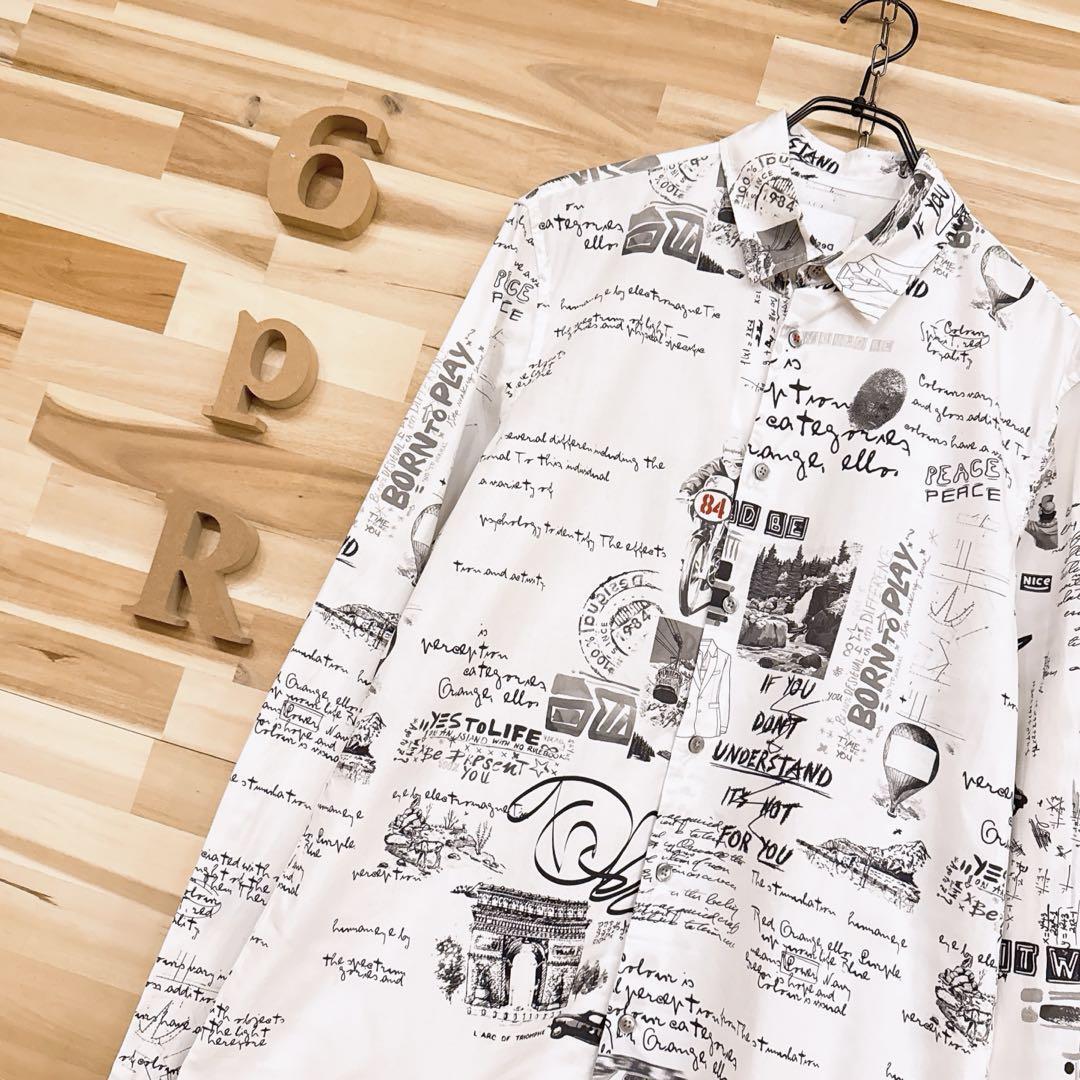 さらっと軽やかなコットン素材が心地よいホワイトベースに、アートグラフィックと筆記体が遊ぶように踊るプリント。ブラックやグレーの繊細なコントラストに、ボタンの赤ステッチやアクセントのレッドカラーがさりげないオシャレ感をプラス。春夏の遊びの効いた抜け感コーデにぴったりなDesigualの長袖シャツです。定価:12,899円。