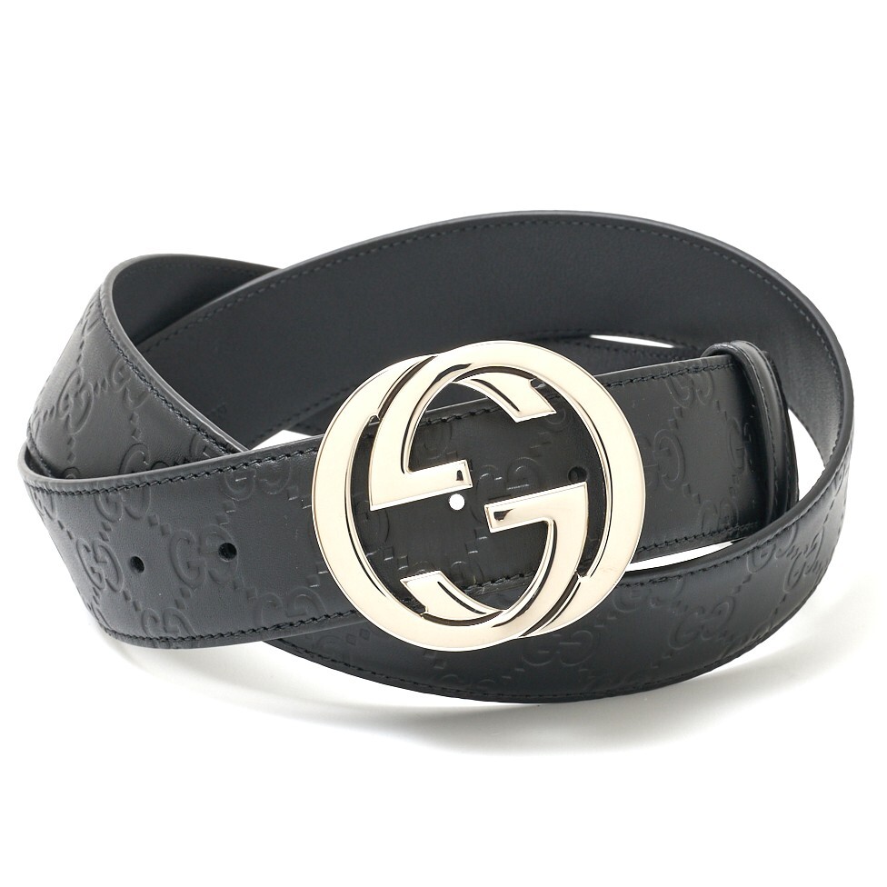 > GUCCI グッチ グッチ シグネチャー レザー ベルト 411924 CWC1N 1000 ブラック×シルバー金具 シンプル カジュアル GG メンズ