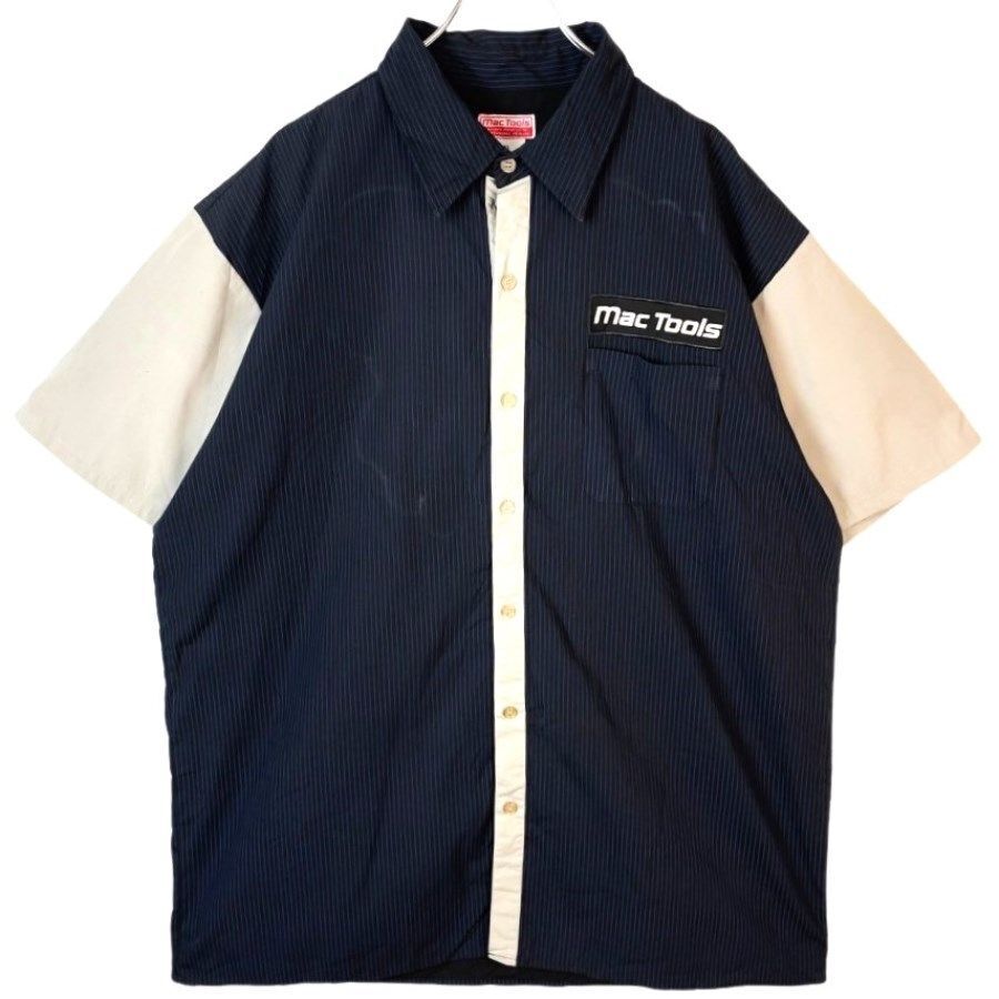 > マックツールズMac Tools半袖ワークシャツ両面デザインデカワッペン企業系アニマル鳥ストライプ紺ネイビー灰色グレーvintage41223
