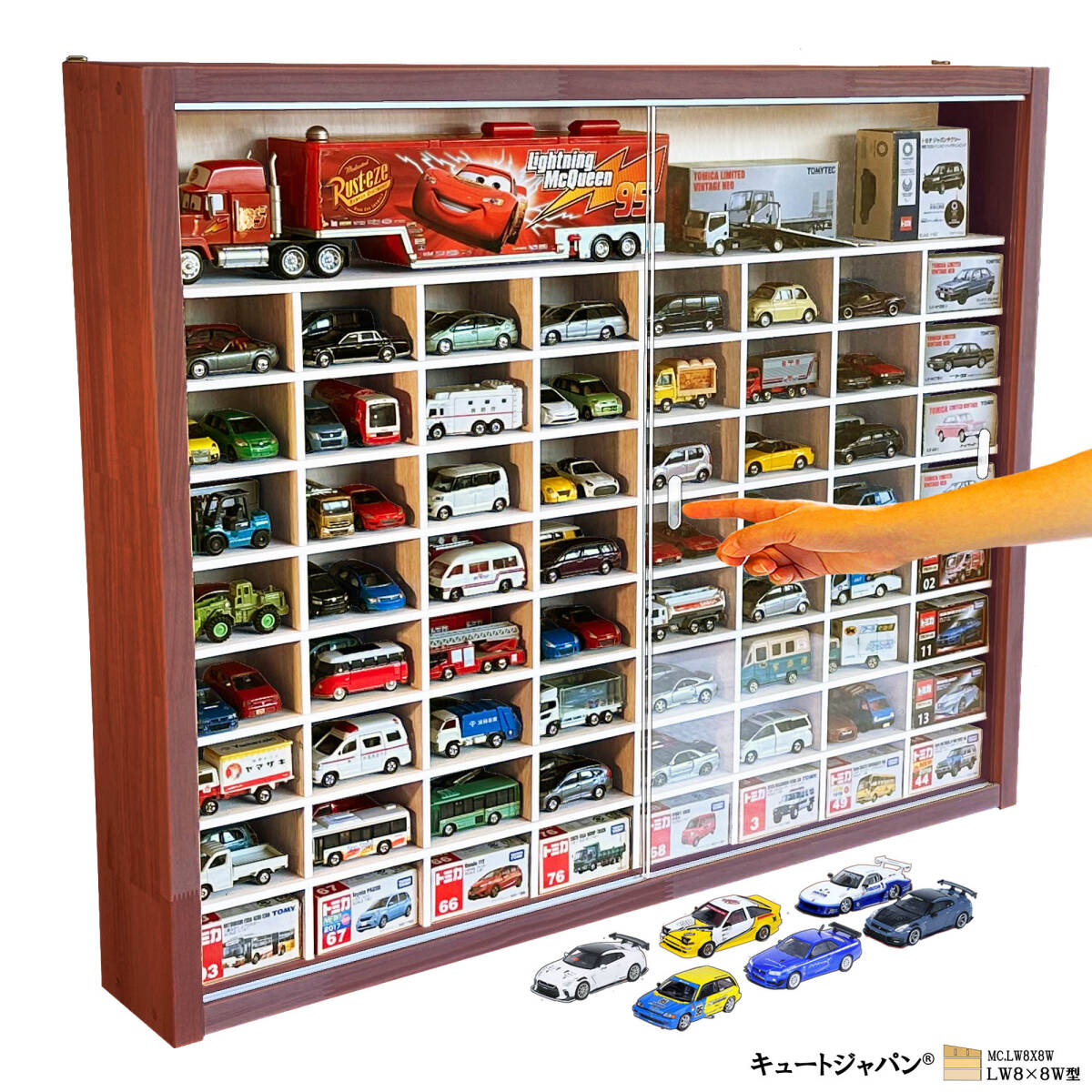 - 送料無料★木製ミニカーケース トミカ128台・大型サイズ収納可能 アクリル障子付 マホガニ色塗装 日本製 LW8×8W型