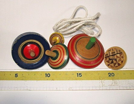 - 昭和レトロ★独楽 コマ 木製玩具 合計5個 寄木細工独楽1個 郷土玩具 最大直径6.2cm 最小直径2.6cm 紐1本★