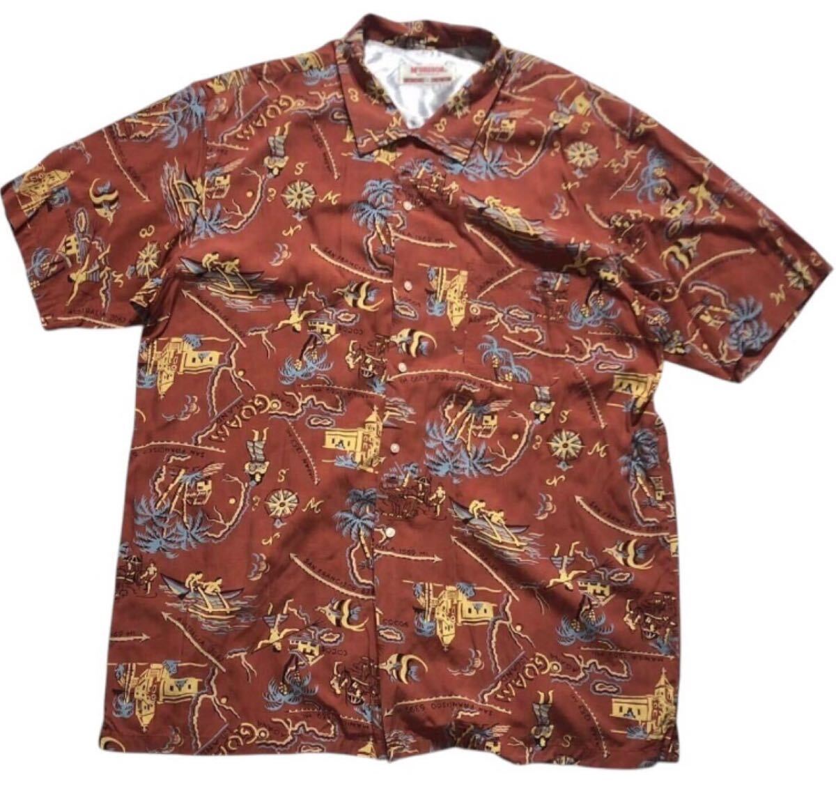 - 送料無料 90s ヴィンテージ ● McGREGOR マックレガー ● メニュー柄デザイン ループ留め オープンカラー アロハ シャツ ブラウン LL