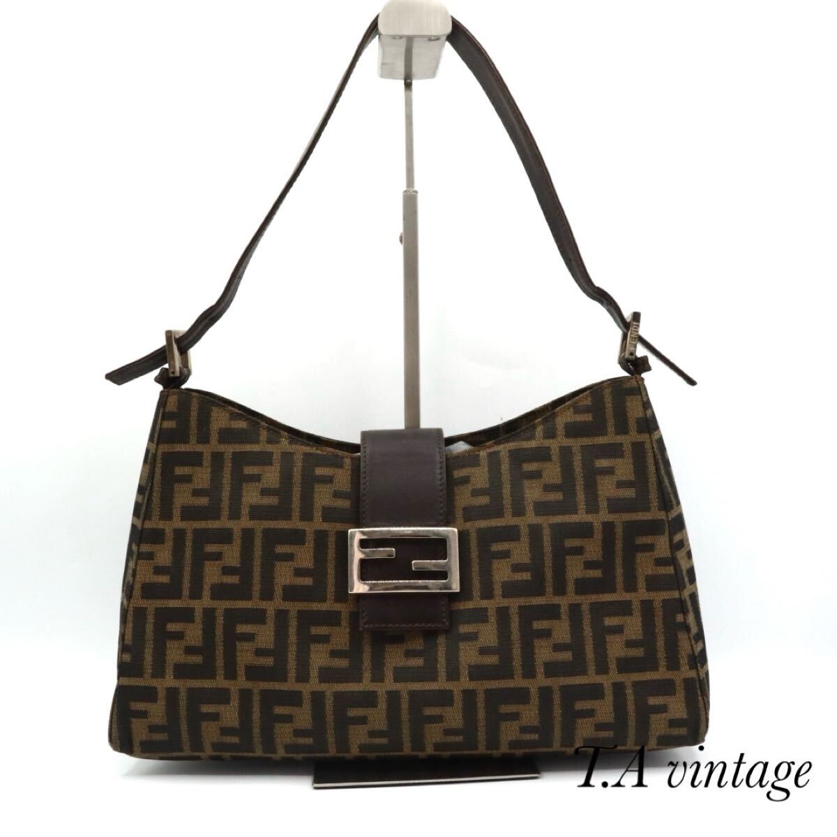 > FENDI 美品 フェンディ ズッカ柄 キャンバス レザー ハンドバッグ ブラウン マンマバケット
