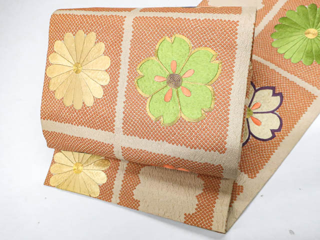 - 《古美術京松》【着物】アンティーク 袋帯 金駒刺繍 お太鼓柄 鹿の子に花文 r7b01-6a