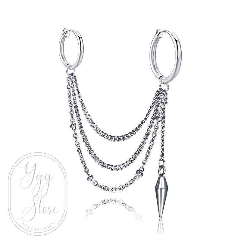 - イヤリング イヤーカフ 3連チェーン×スタッズ付 イヤーカフリンク アクセサリー ロングチェーン ノンホールピアス 鎖 シルバー 男女兼用