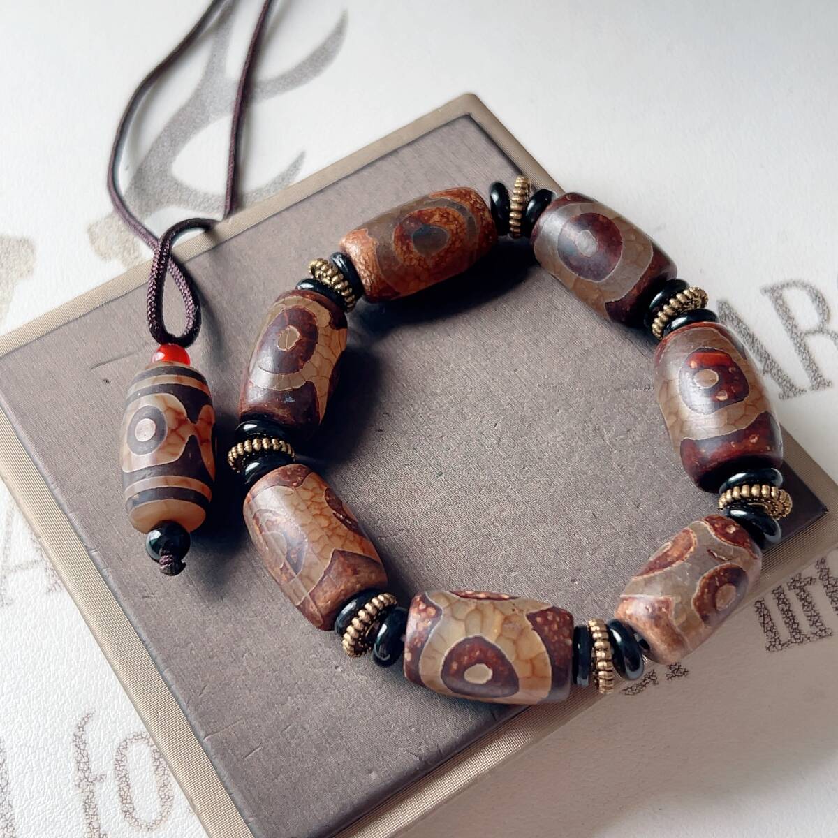 > ◇三目天珠◇瑪瑙◇ブレスレット+ネックレス計2点セット◇男女兼用◇パワーストーン◇天然石◇巾着袋付き◇プレゼントにも030S4101