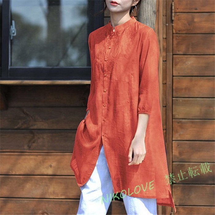 - 新品 ワンピース レディース 40代 春夏トップス 綿麻混 チュニック ゆったり シャツワンピース 7分袖 リネンシャツ スリット 刺繍M-3XL