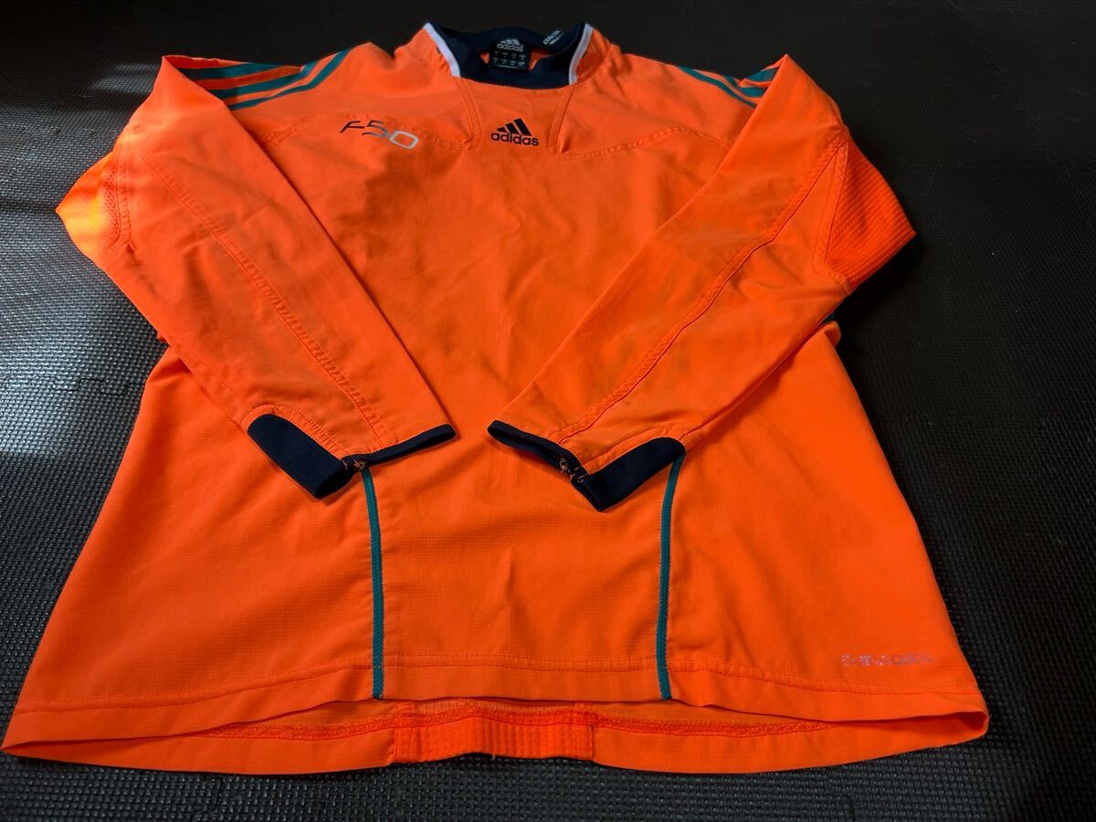 - 美品adidas蛍光色オレンジ、黒、白、ロゴ黒、ライングリーングラディーション、ストレッチトップス サイズM